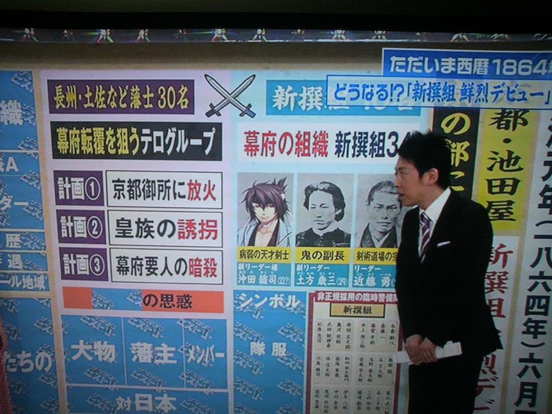 アナウンサーの丁度顎の辺りに居るのが近藤さん、その隣が土方さん、そしてそのまた隣が、沖田です。